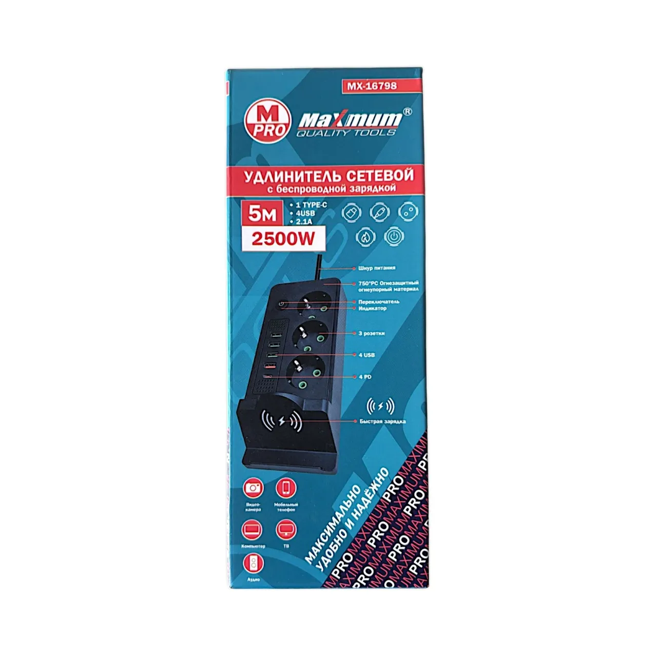 Фильтр сетевой 5 метров с беспроводной зарядкой от "Maximum Quality Tools" - это отличный выбор для тех, кто хочет обеспечить безопасную работу своих электронных устройств. Черный сетевой фильтр оборудован современной беспроводной зарядкой, 3-мя Евро розетками, 4-мя USB портами и 1-м разъемом Type-C, что позволяет быстро и легко заряжать свои устройства без необходимости использовать провода. Удлинитель имеет входное напряжение 220 В и номинальный ток 16 А.
