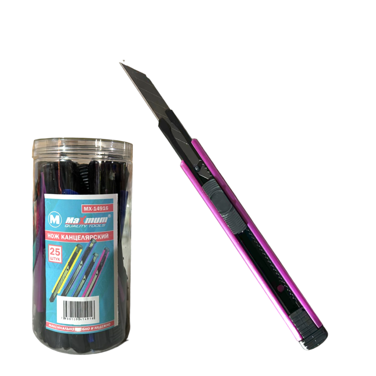 Нож канцелярский с фиксатором и металлической направляющей оборудован сегментированным лезвием 11× 85 мм и поставляется в различных цветах. Канцелярские ножи длиной 145 мм поставляются по 25 шт. в пластиковом боксе от "Maximum Quality Tools" и предназначены для резки бумаги, картона, ткани и пластика. Ребристый пластиковый корпус надежно лежит в руке и не скользит. Отламывающиеся сегментированные стальные лезвия не боятся коррозии и имеют качественную заводскую заточку. Система фиксации лезвия push-lock и насадка для безопасного отделения сегмента лезвия делают работу безопасной.