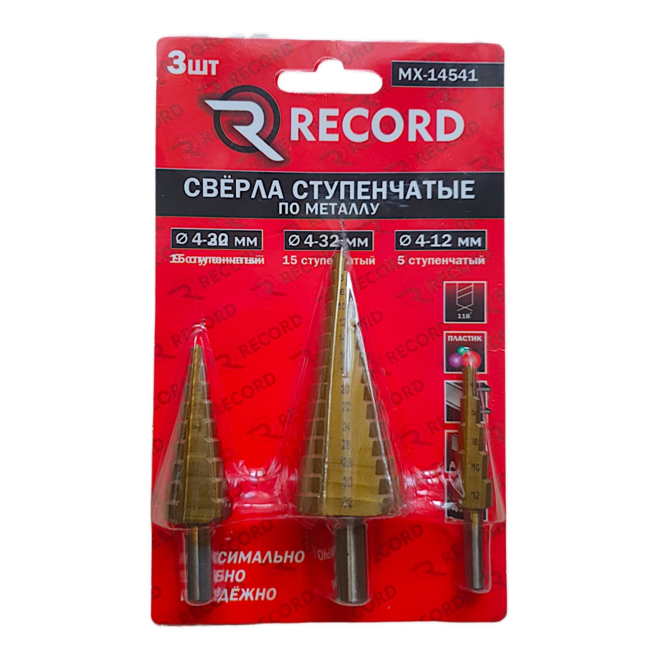 Набор содержит ступенчатые сверла HSS на 5, 9, 15 ступеней с шагом в 2 мм.