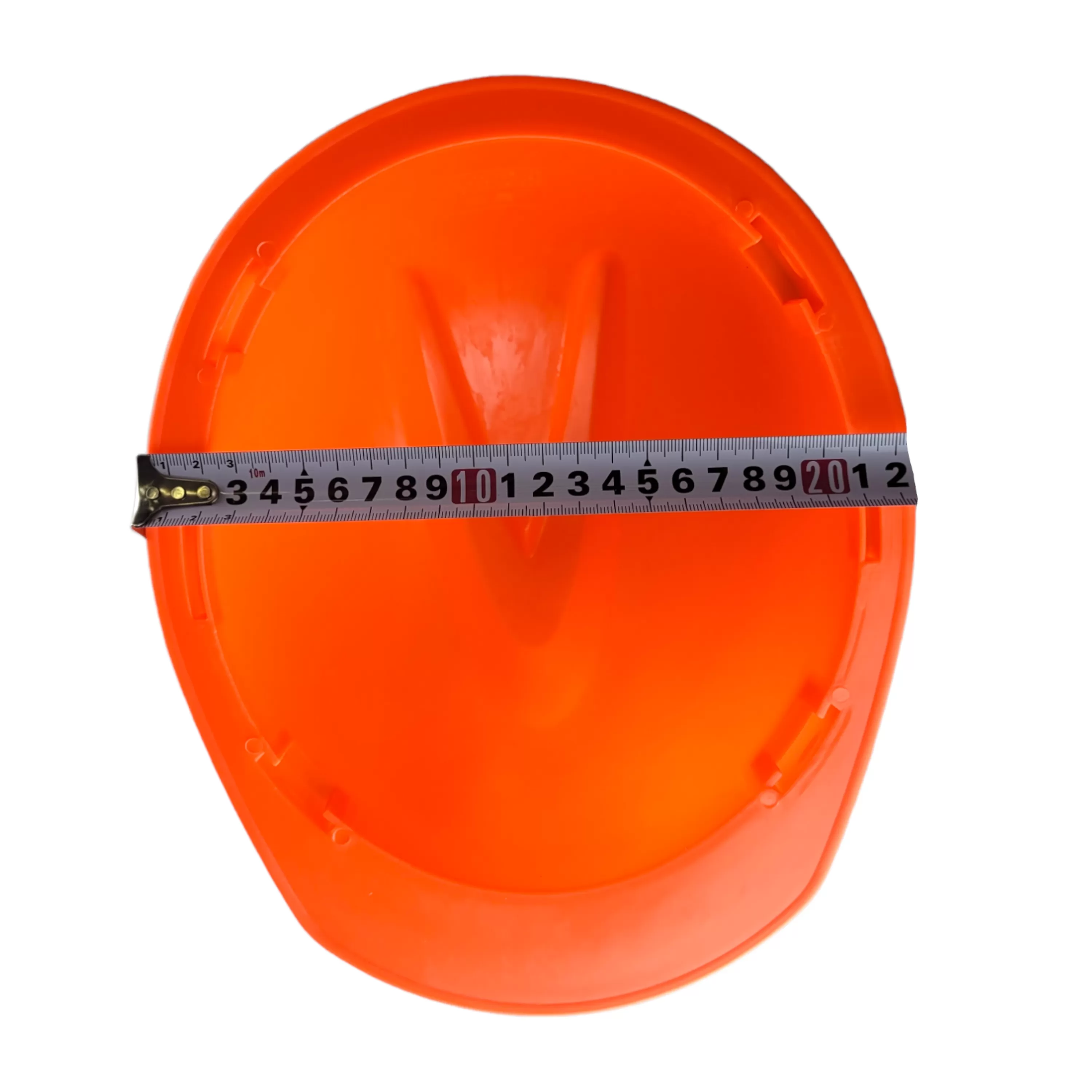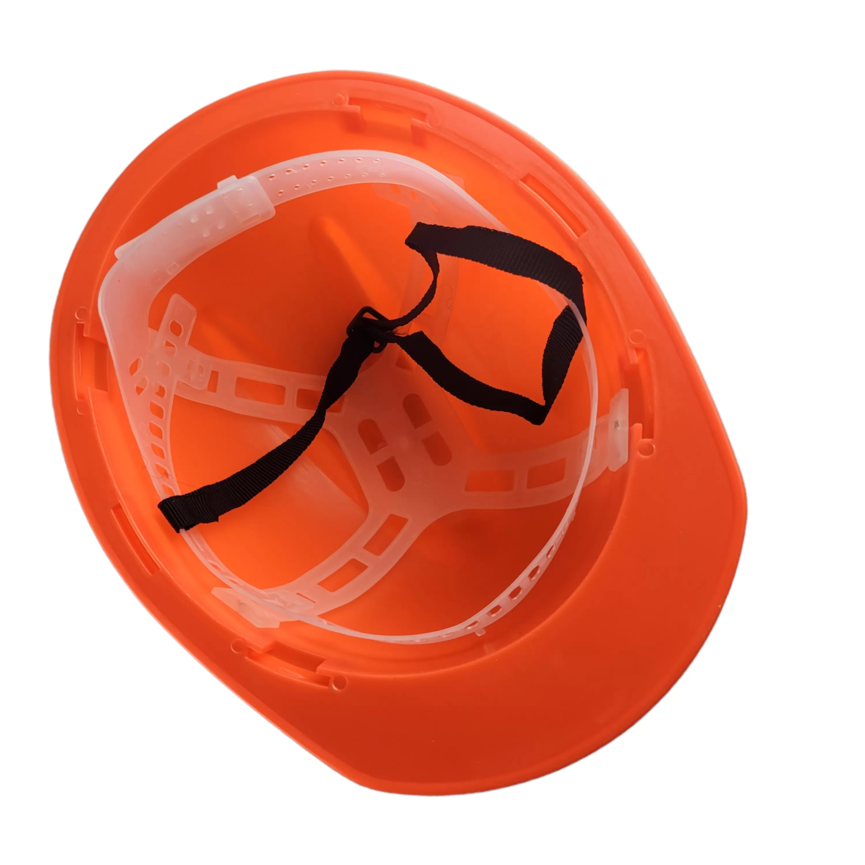 Защитная оранжевая каска легкая и прочная выполнена из полипропилена.